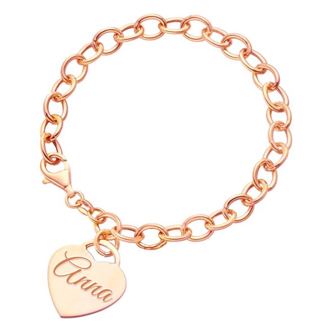 Deze bedelarmband met naambedel rose goudkleurig is één van de vele armbanden uit onze armband graveren collectie Een super gave armbanden collectie allemaal om te graveren de meeste armbanden zijn van leer of edelmetaal en dus geschikt voor mensen met een allergie.