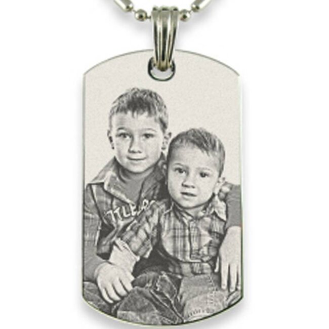 Laat een dog tag graveren met ketting zilverkleurig met jouw foto en of tekst kies bijvoorbeeld een leuke foto van een geliefde en laat deze op de voorkant graveren kies dan ook een leuke tekst, of laat de naam van de persoon op de achterkant graveren.