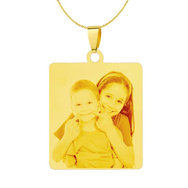 Laat de ketting graveren met hanger vierhoek goudkleurig met jouw foto en of tekst kies bijvoorbeeld een leuke foto van een geliefde en laat deze op de voorkant graveren kies dan ook een leuke tekst, of laat de naam van de persoon op de achterkant graveren.