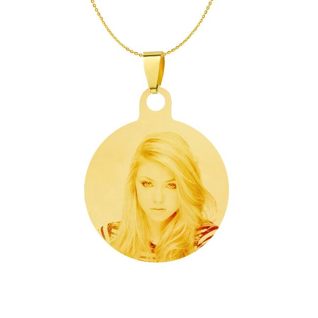 Laat de ketting graveren met hanger rond goudkleurig met jouw foto en of tekst kies bijvoorbeeld een leuke foto van een geliefde en laat deze op de voorkant graveren kies dan ook een leuke tekst, of laat de naam van de persoon op de achterkant graveren.