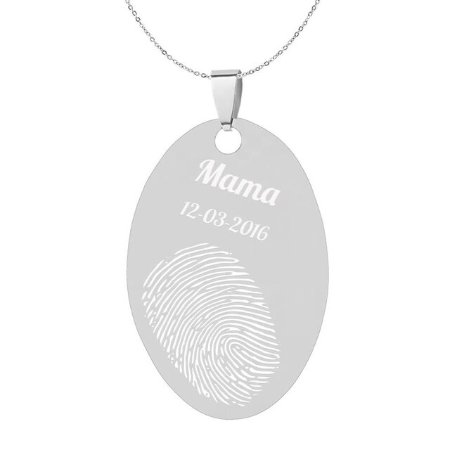 Het vingerafdruk sieraad ovaal zilverkleurig zijn er in verschillende soorten en maten ook de ketting kan je in een andere maat krijgen laat dit ons even weten door een belletje of in het opmerkingen veld bij de bestelling.